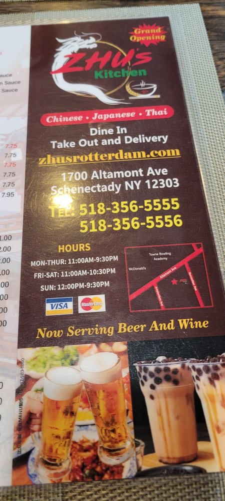 Zhu's Kitchen offers a diverse menu blending Chinese, Thai, and Japanese cuisine. Located in Schenectady, NY, this restaurant provides delivery, takeout, and outdoor seating options. Standout appetizers like shrimp egg roll, scallion pancakes, and steamed pork dumplings showcase the range of flavors available. The salad selection features fresh ingredients like avocado and seaweed, while the soup offerings include wonton and hot & sour varieties. Customer reviews praise the generous portion sizes, friendly staff, and delicious dishes such as roasted pork spicy basil fried rice and Szechuan wontons. With a comfortable atmosphere and standout items like fried scallops and chicken wings, Zhu's Kitchen is a must-try for anyone craving flavorful Asian cuisine. Their Boba Tea is also highly recommended for a refreshing drink option.